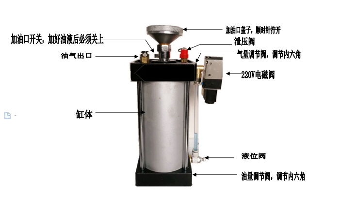 压缩空气通过过滤减压阀后,由二位三通电磁阀来控制气源的开启,可实现与设备加工的同步进行。由节流阀控制油气进行微量润滑。通入压缩空气后,气缸内的油压升高通过油节流阀控制将油缸内的油定量排出,经节流阀控制出油,一个节流阀控制两路压缩空气带动喷管内的油精确喷到润滑点,避免产生雾化。当电磁阀关闭后即停止供油。用油量的大小直接由节流阀控制,结构简单,直观易操作。